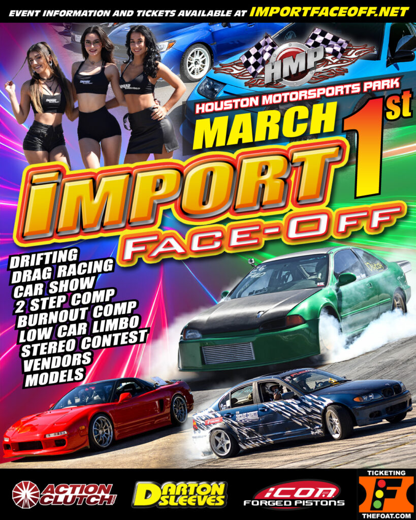 The IMPORT FACE-OFF national car show series will be at Houston Motorsports Park in Houston, TX on 3/1/26! SERIES INFO ON WWW.IMPORTFACEOFF.NET